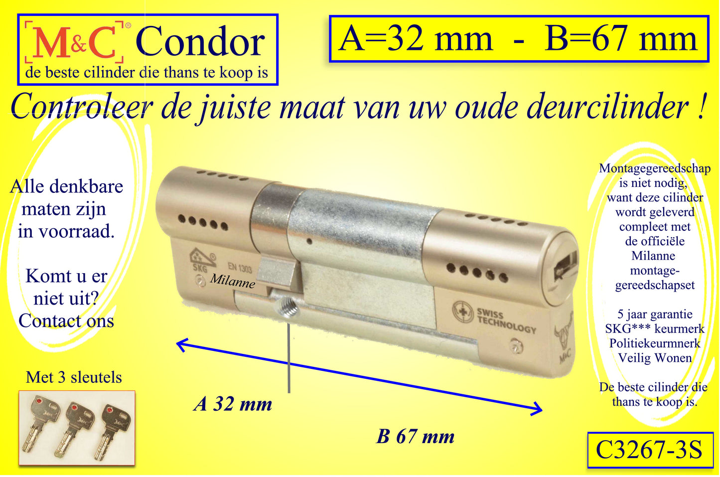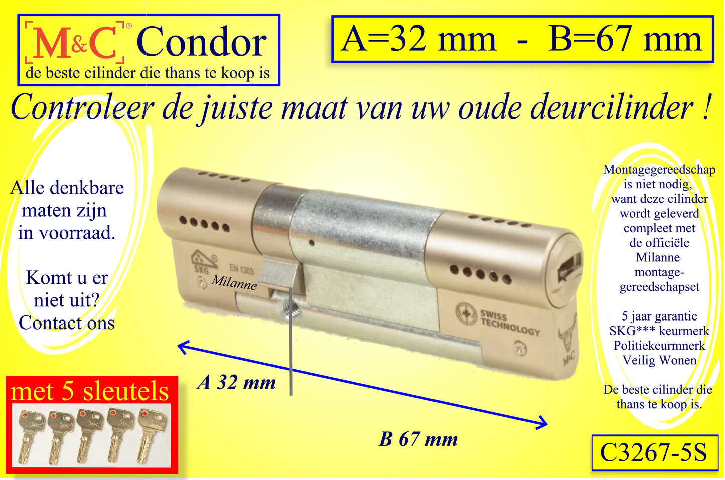 De M&C Condor cilinder is één van de meest veilige deurcilinders die u thans kunt kopen. Hij is beveiligd tegen de meest actuele inbraakmethodes en is bestand tegen Lockpicken, Kerntrekken, cilinder Breken en ook de "klopmethode". De speciaal ontworpen sleutel maakt het ongeoorloofd kopiëren vrijwel onmogelijk. En dan de prijs.........