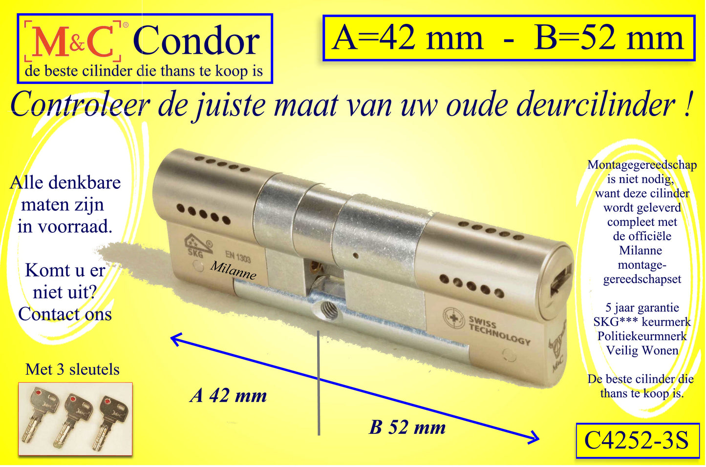 De M&C Condor cilinder is één van de meest veilige deurcilinders die u thans kunt kopen. Hij is beveiligd tegen de meest actuele inbraakmethodes en is bestand tegen Lockpicken, Kerntrekken, cilinder Breken en ook de "klopmethode". De speciaal ontworpen sleutel maakt het ongeoorloofd kopiëren vrijwel onmogelijk. En dan de prijs.........