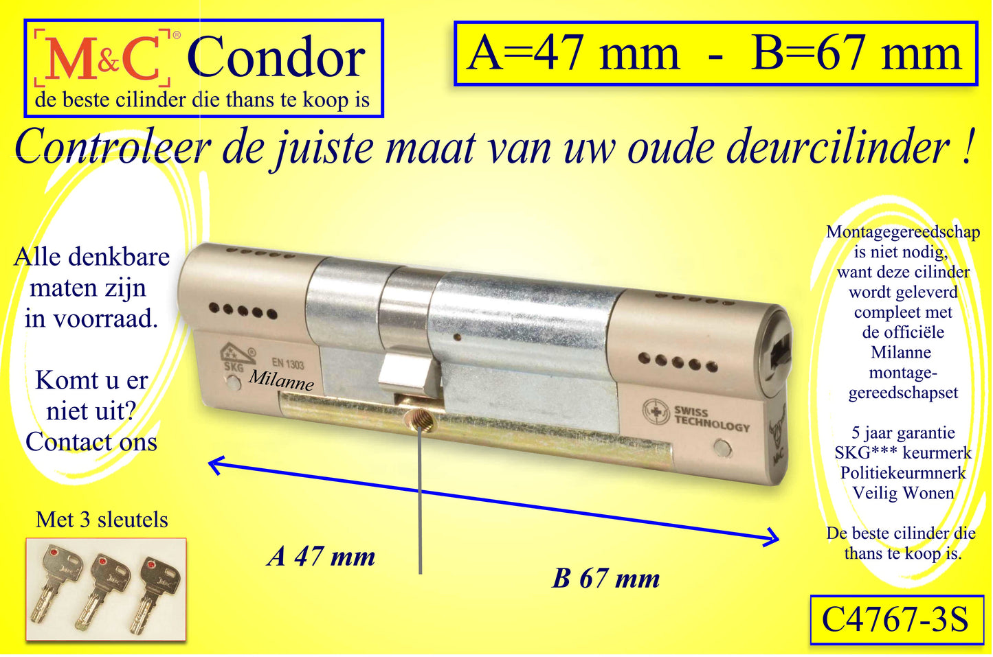 De M&C Condor cilinder is één van de meest veilige deurcilinders die u thans kunt kopen. Hij is beveiligd tegen de meest actuele inbraakmethodes en is bestand tegen Lockpicken, Kerntrekken, cilinder Breken en ook de "klopmethode". De speciaal ontworpen sleutel maakt het ongeoorloofd kopiëren vrijwel onmogelijk. En dan de prijs.........
