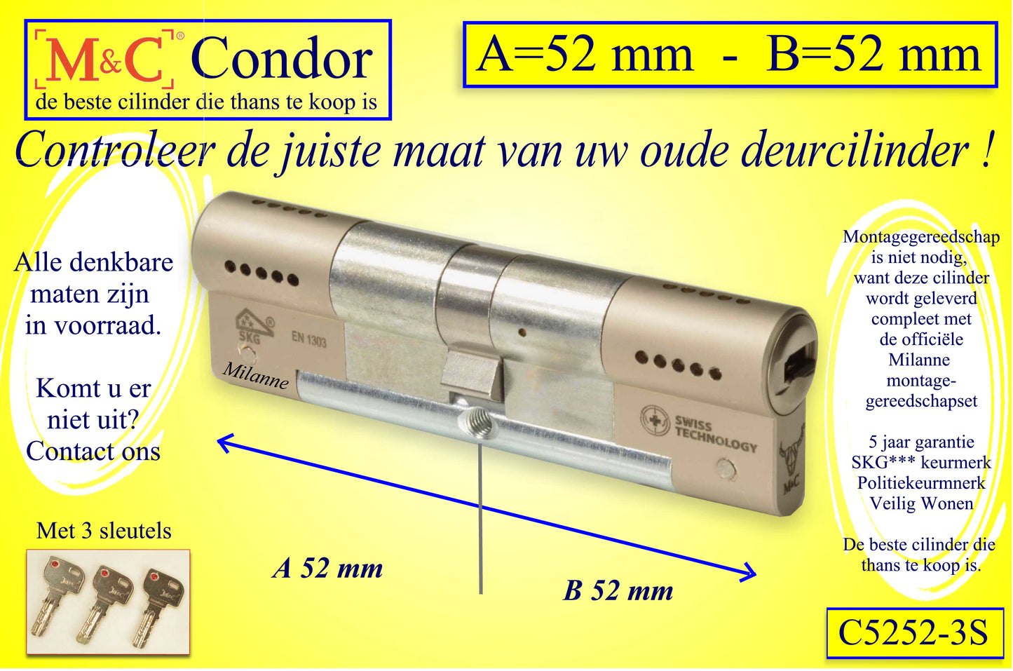 De M&C Condor cilinder is één van de meest veilige deurcilinders die u thans kunt kopen. Hij is beveiligd tegen de meest actuele inbraakmethodes en is bestand tegen Lockpicken, Kerntrekken, cilinder Breken en ook de "klopmethode". De speciaal ontworpen sleutel maakt het ongeoorloofd kopiëren vrijwel onmogelijk. En dan de prijs.........