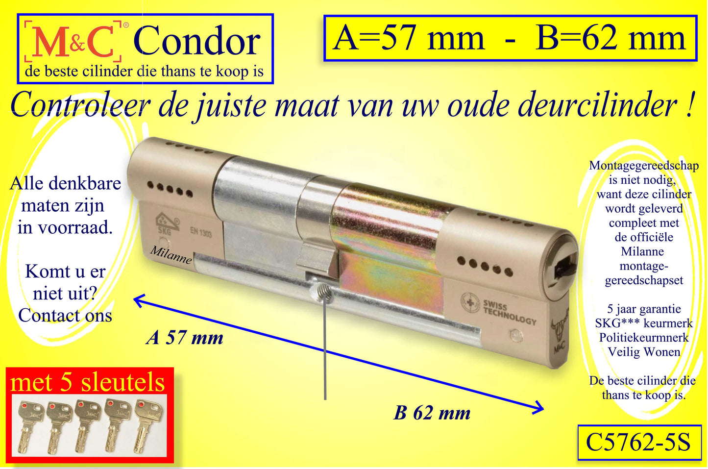 De M&C Condor cilinder is één van de meest veilige deurcilinders die u thans kunt kopen. Hij is beveiligd tegen de meest actuele inbraakmethodes en is bestand tegen Lockpicken, Kerntrekken, cilinder Breken en ook de "klopmethode". De speciaal ontworpen sleutel maakt het ongeoorloofd kopiëren vrijwel onmogelijk. En dan de prijs.........