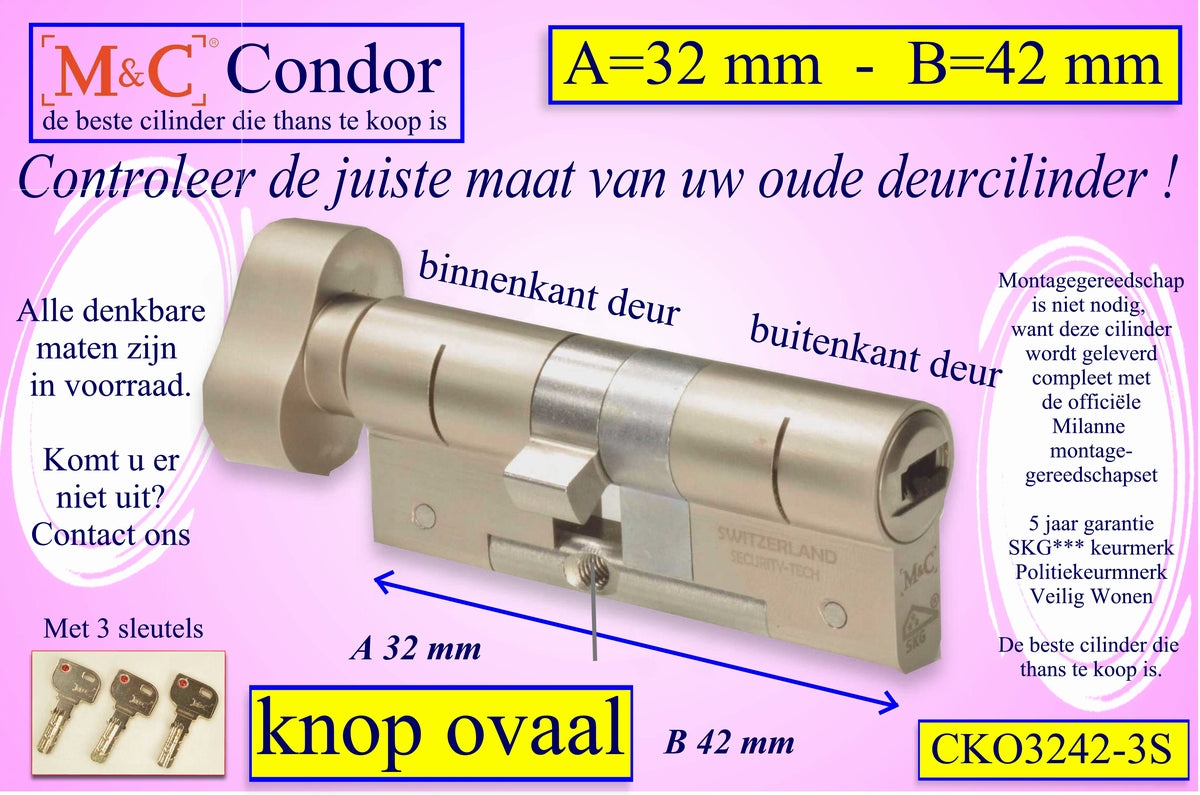 M&C Condor cilinderslot Knop OVAAL 32x42 mm met 3 sleutels