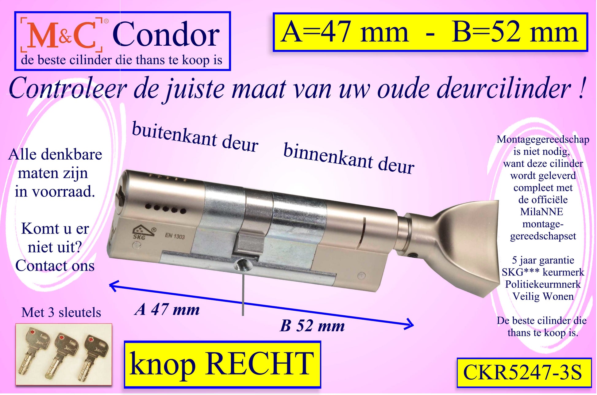 M&C Condor cilinderslot Knop RECHT 52x47 mm met 3 sleutels