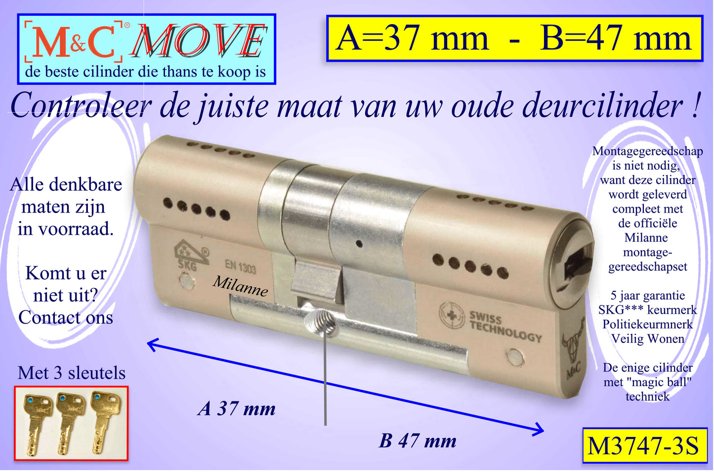 M&C Move cilinderslot 37x47 mm - met 3 sleutels