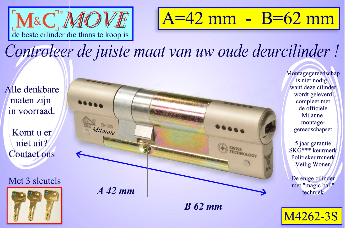 M&C Move cilinderslot 42x62 mm - met 3 sleutels